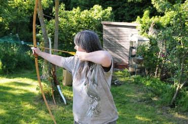 I do English Longbow archery lessons for beginners, and ‘top-ups’ for the more experienced, at my workshop range. As a beginner there is no need to purchase any equipment before you come…I supply the bows, arrows, armguards and tabs (finger guards).